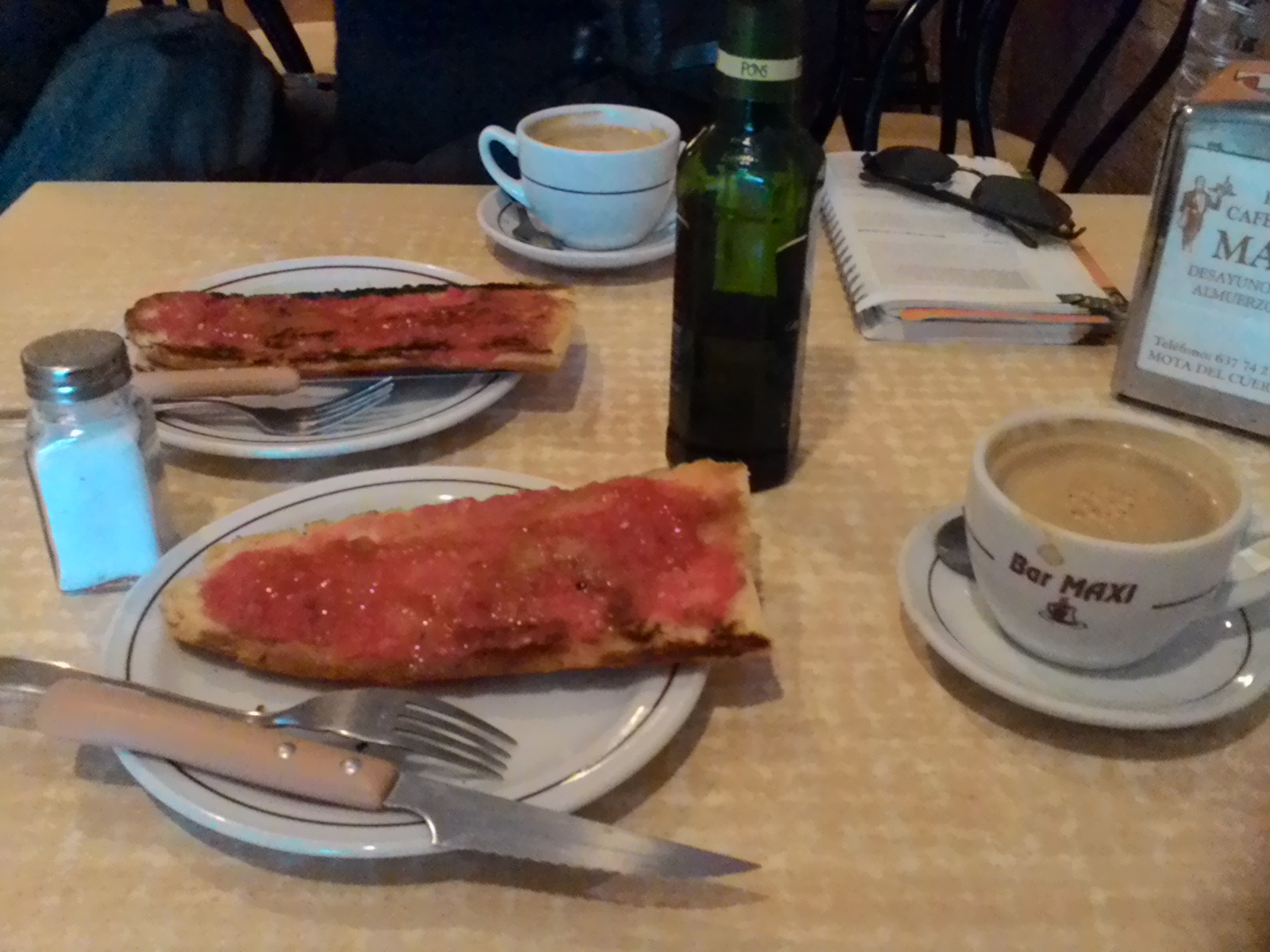 Great morning in Mota del Cuervo. Sunrise at the hilltop with 7 windmills. They say one of them is working. After a quick breakfast of tomato paste with oilve oil on toast, we are on our way.