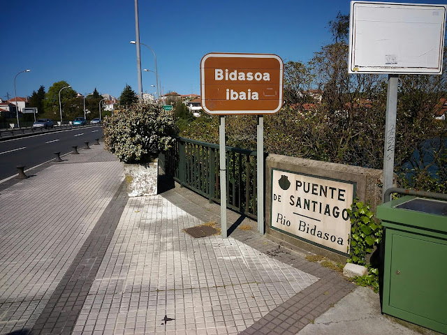 After checking into the albergue we took a nice walk to Hendaye (France) via the St. James bridge. One side in Spanish and the other in French. In Hendaye, Michael couldn't resist the temptation to go inside the French pastry shop and ended up buying Basque custard cakes from the nice lady inside. Back to Spain and a stroll along a typical Basque river mouth that separates France and Spain with small boats and people canoeing.